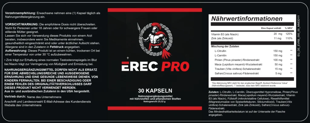 ErecPro kombiniert sorgfältig ausgewählte Vitamine, Mineralstoffe, Pflanzenextrakte und Aminosäuren, die traditionell zur Unterstützung von Energie, Ausgeglichenheit und männlichem Wohlbefinden eingesetzt werden.